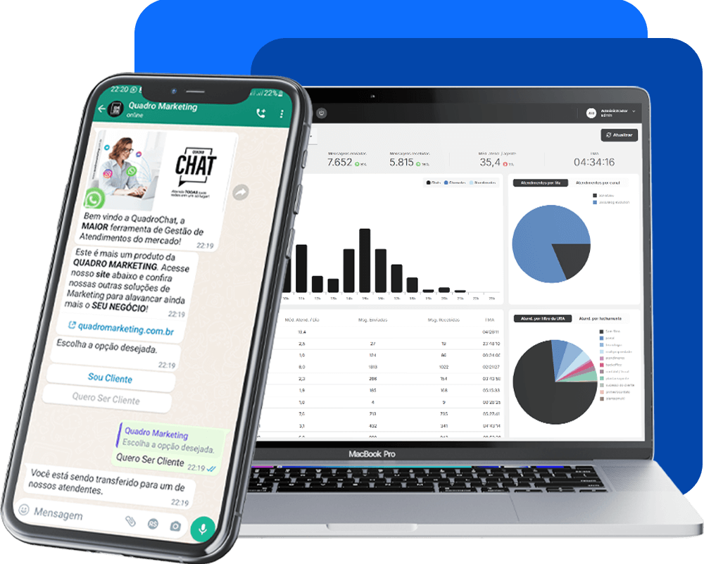 O QuadroChat é uma plataforma de atendimento unificado que integra redes sociais, WhatsApp, CRM (Customer Relationship Management), chatbots e automações, proporcionando uma gestão eficiente de tarefas e relatórios da equipe.